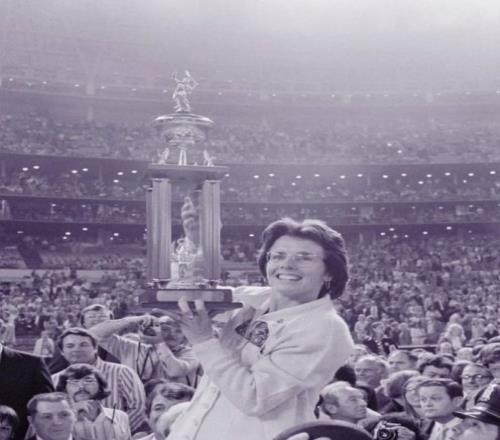 比如,我們?nèi)プ匪輾v史,去看 1973 年的“性別之戰(zhàn)”,比利·簡·金對戰(zhàn)鮑比·里格斯。在 3 萬名現(xiàn)場觀眾和 1.4 億全球電視觀眾的見證下,29 歲的比利戰(zhàn)勝了男子溫網(wǎng)冠軍里格斯,贏得了歷史性的勝利。