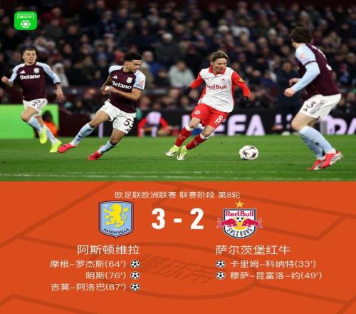北京時間1月30日歐足聯歐洲聯賽 聯賽階段 第8輪,阿斯頓維拉對陣薩爾茨堡紅牛。上半場卡里姆-科納特破門,下半場穆薩-昆富洛-約擴大比分,摩根-羅杰斯扳回一球,明斯扳平,吉莫-阿洛巴反超。最終比分阿斯頓維拉 3-2 薩爾茨堡紅牛獲第二名直接出線。